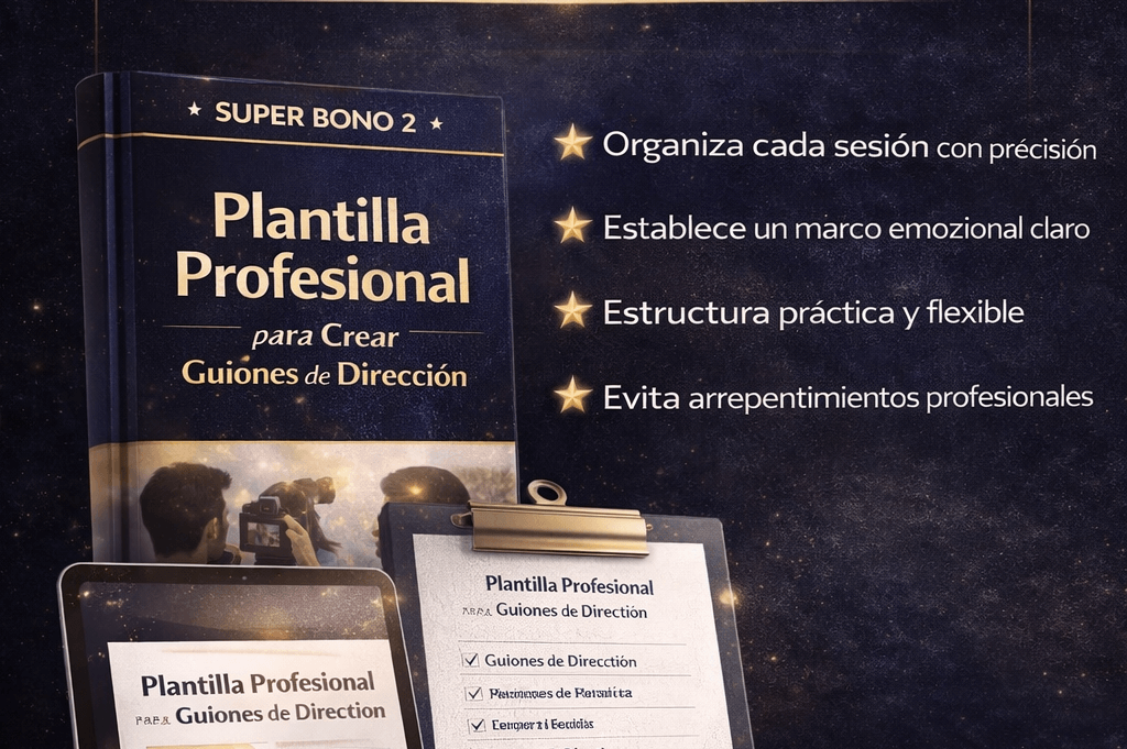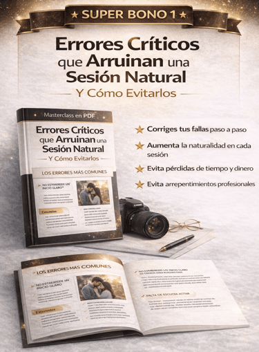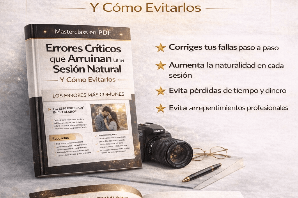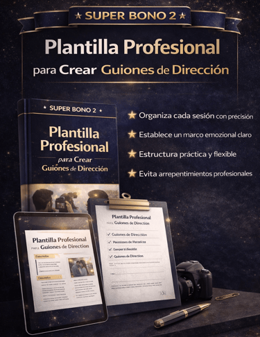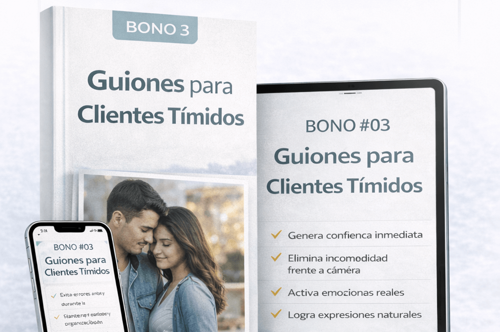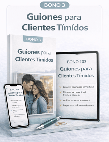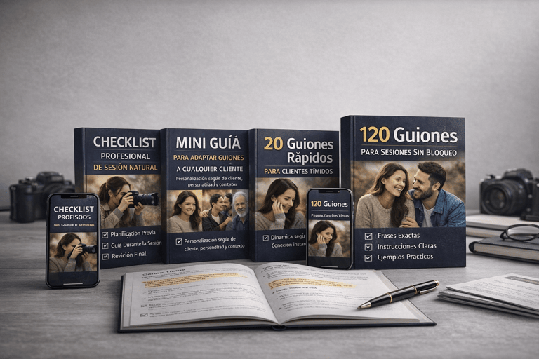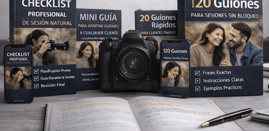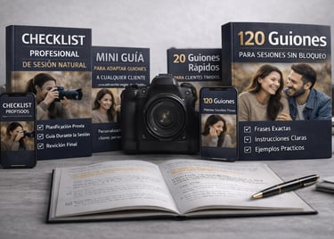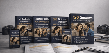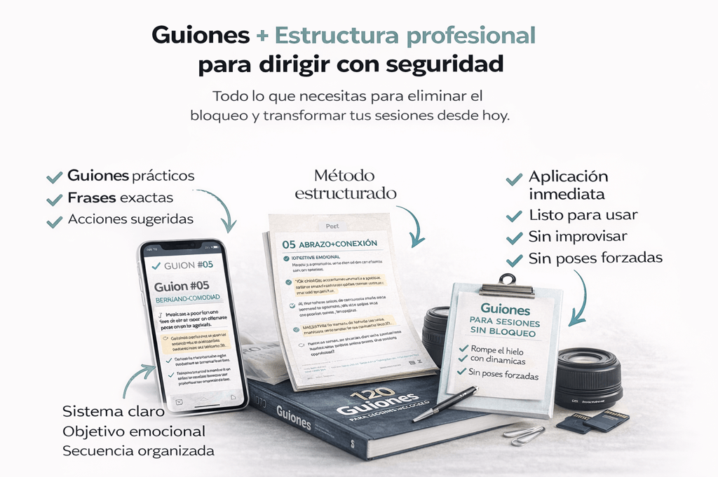 Descubre los 120 guiones estructurados que usan fotógrafos profesionales para dirigir sin bloqueos y crear sesiones naturales que venden.